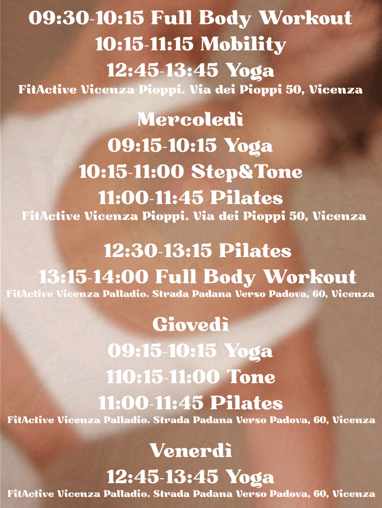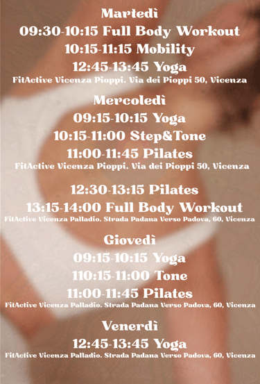 Qui sotto trovi i miei orari presso le palestre FitActive di Vicenza, stagione 2025 - 2026: